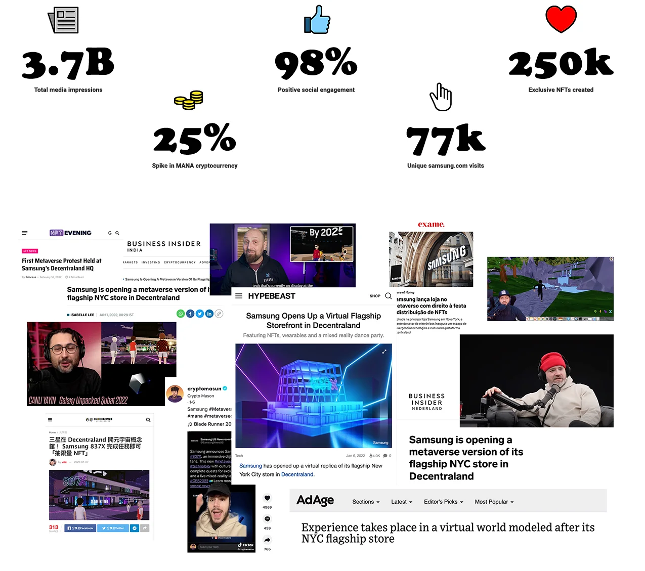 Scoring the largest brand takeover in Decentraland to date (done in 6 weeks btw!), this CES marked a bold milestone for Samsung. In just 24 hours, 19,000+ people experienced Samsung 837X and 54,000 NFTs were claimed, garnering 16,000 social media mentions. Within a week, the event earned more than a billion organic impressions. A whopping 98 percent of the buzz was positive!